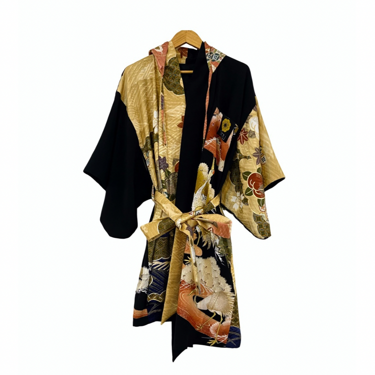 TATZU 黒留袖リメイク スタンドカラー アシンメトリー ガウンパーカー / Remade Kurotomesode Gown Hoodie