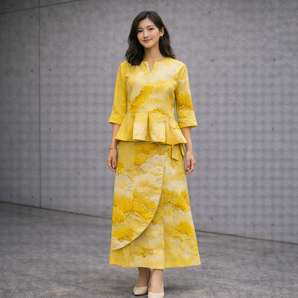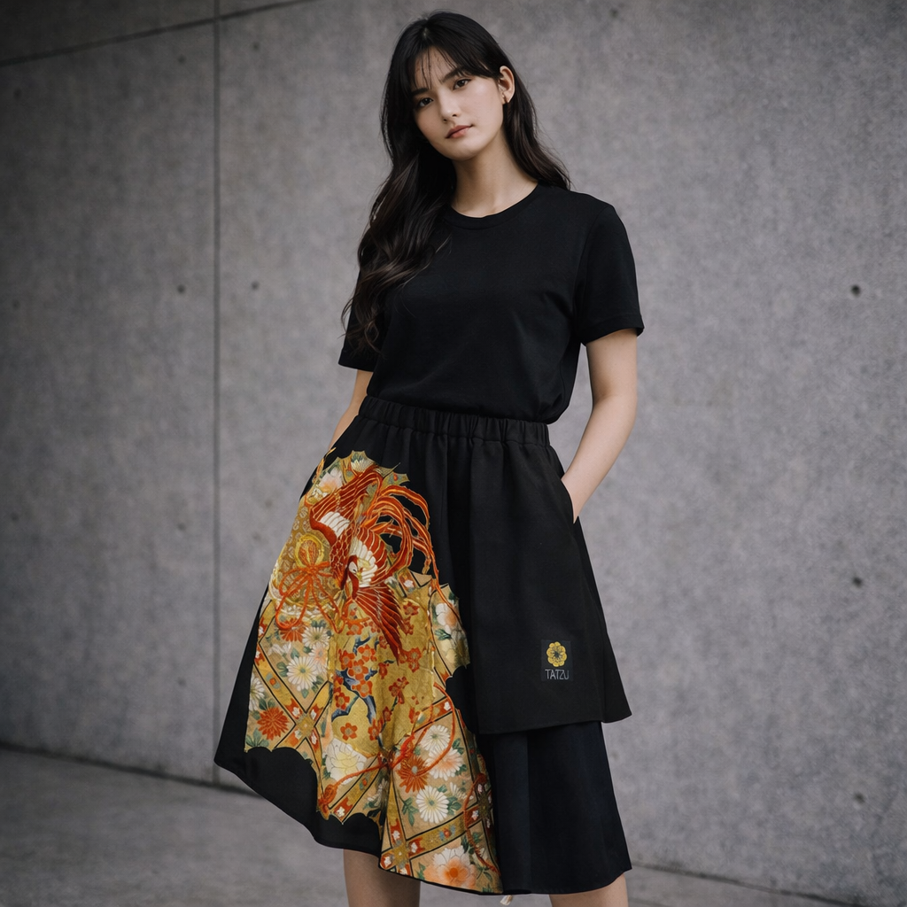 同一のヴィンテージ着物からトップスとボトムスを再構築した、TATZUの一点ものセットアップコレクション。柄の流れと余白を計算し、上下で呼応する構図を設計。単体でも成立する構造を持ちながら、セットで纏うことで完成する世界観を表現しています。伝統文様とモードシルエットが交差する、量産では再現できないアップサイクルピース。ストリートからフォーマルまで、圧倒的な存在感を放つコーディネート提案です。
